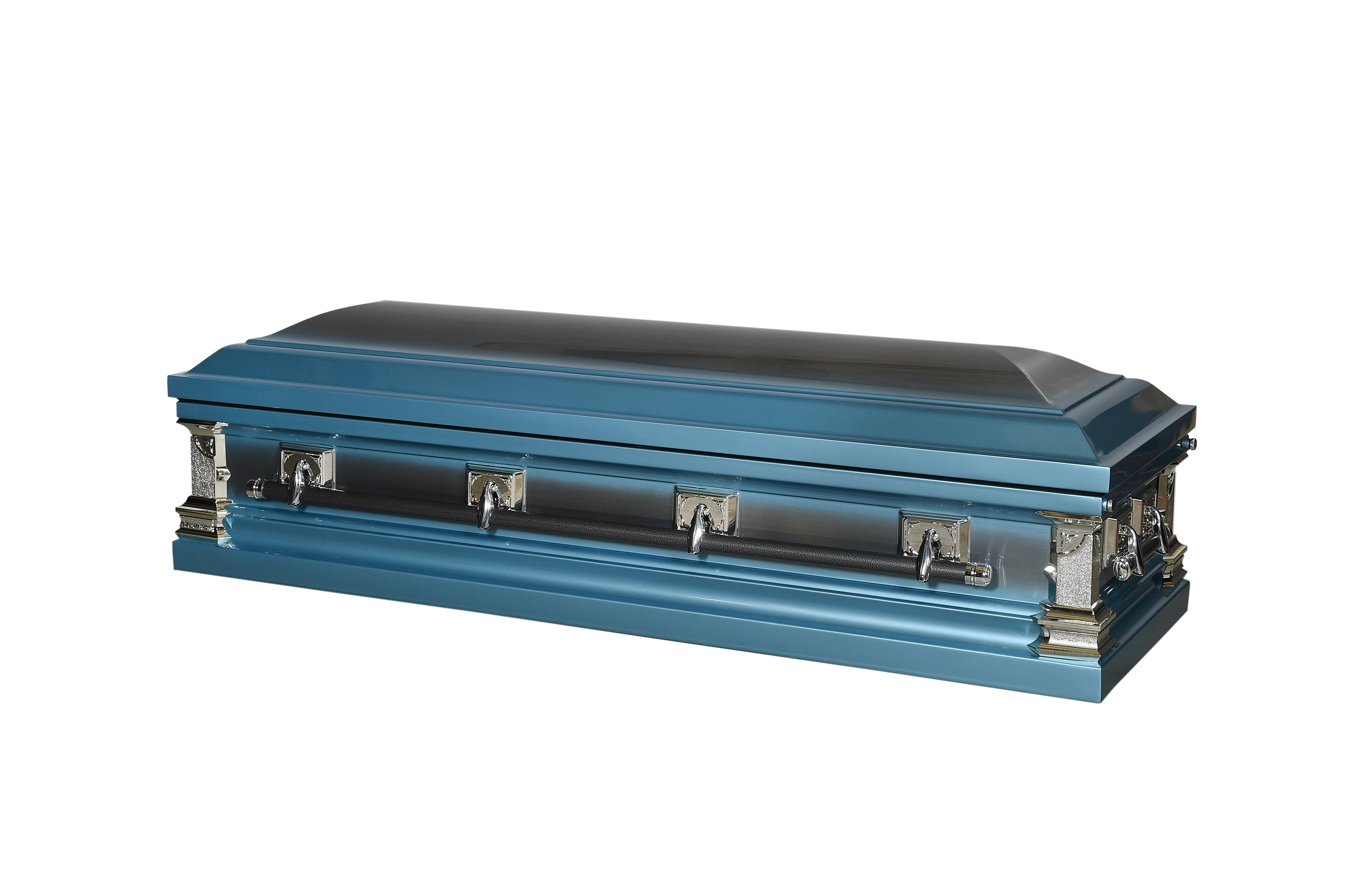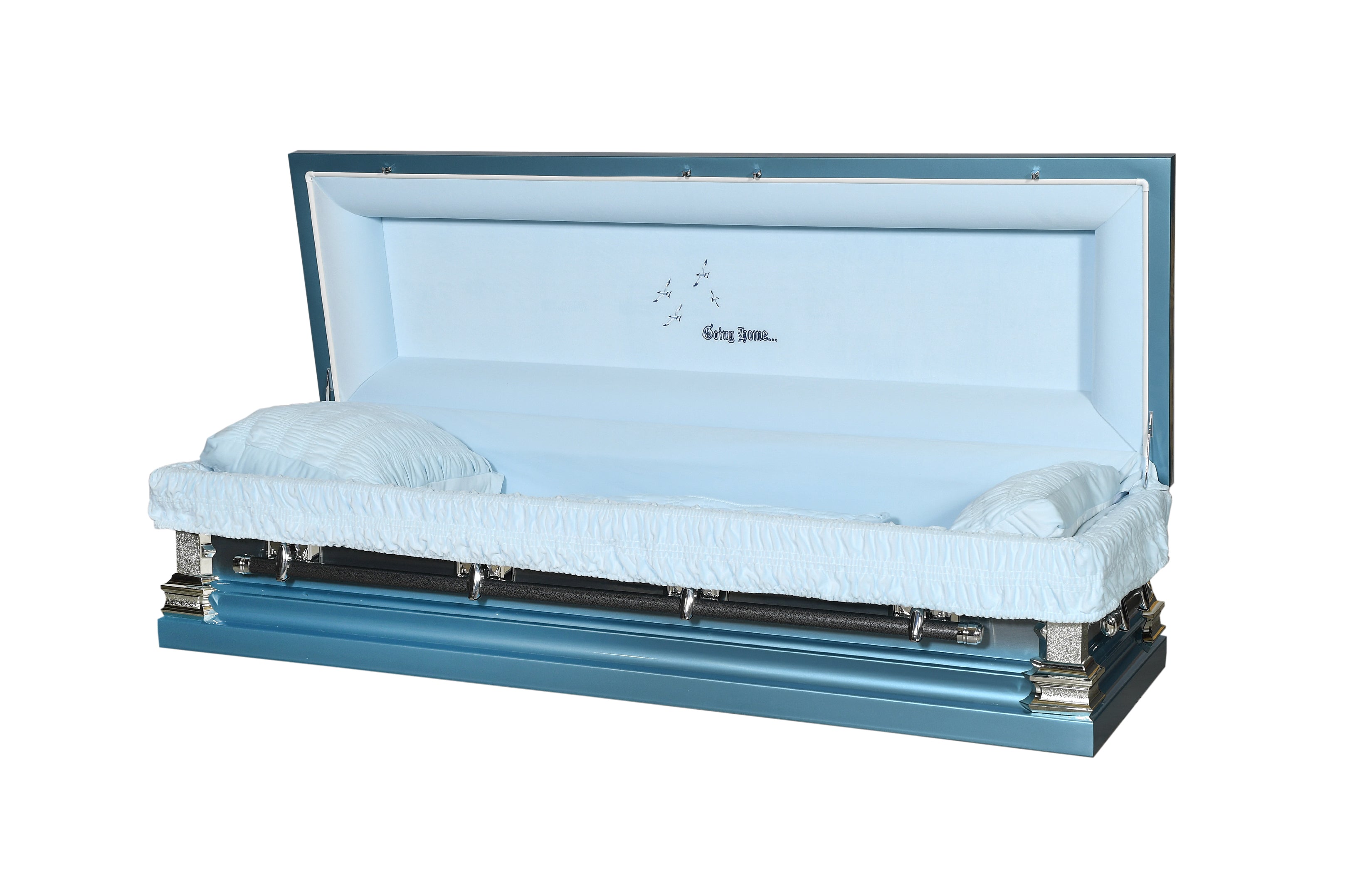 El ataúd Going Home Steel Full Couch simboliza con belleza la serenidad y la paz eterna. Fabricado con acero resistente de calibre 18 con juntas, ofrece fuerza y elegancia para una despedida memorable. El acabado azul tormenta con cepillado natural crea una apariencia suave y reflectante que transmite calma y consuelo. En su interior, el ataúd cuenta con un lujoso interior de terciopelo azul con un panel bordado con la inscripción «Going Home», que simboliza un viaje apacible y el descanso eterno. La cama ajustable y la almohada de terciopelo a juego garantizan la comodidad y la postura adecuadas, mientras que las asas plateadas y los herrajes pulidos añaden una sofisticación refinada. Cada detalle del ataúd Going Home 18G Full Couch está diseñado para honrar a un ser querido con gracia, maestría y un profundo significado.