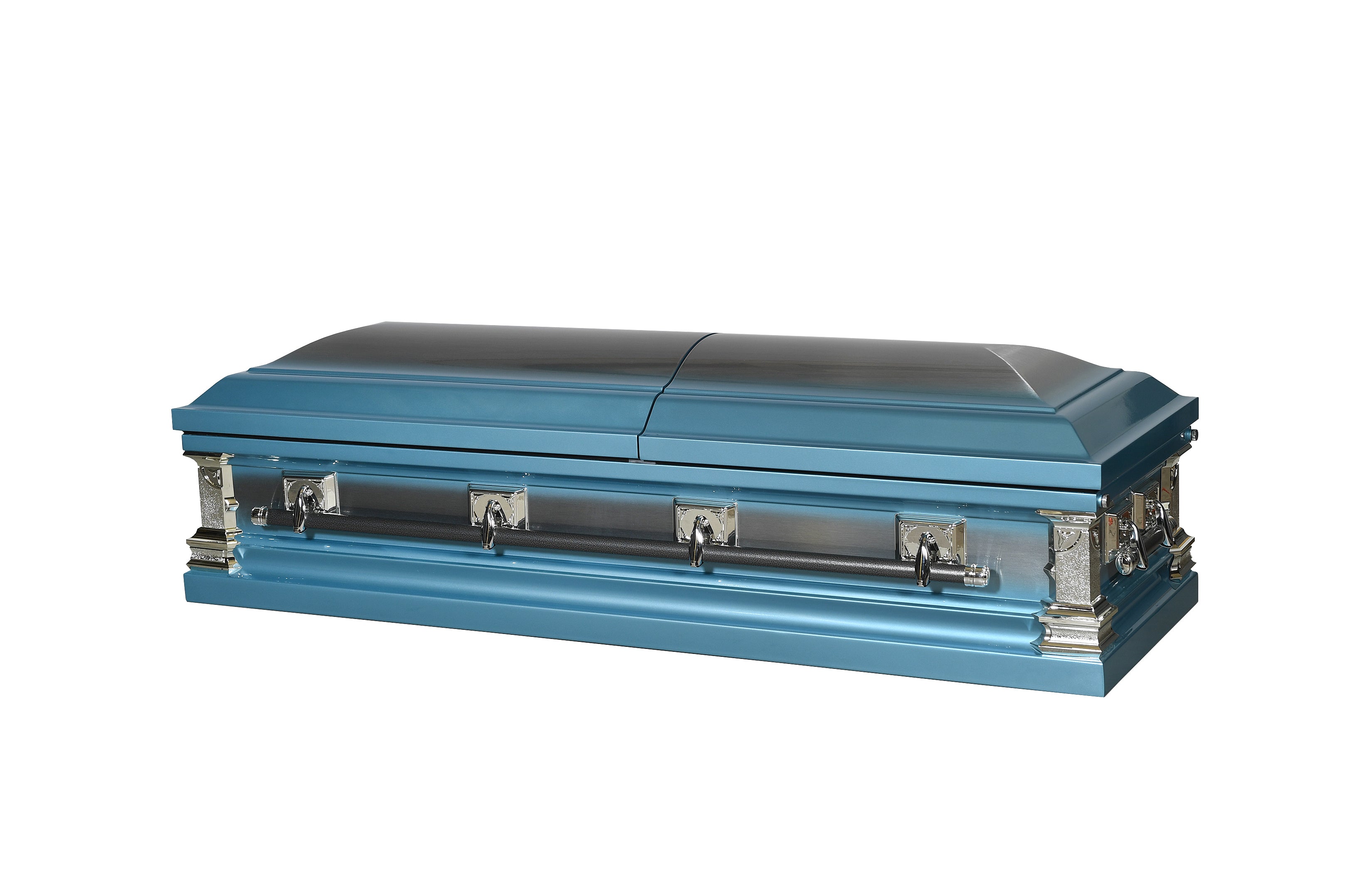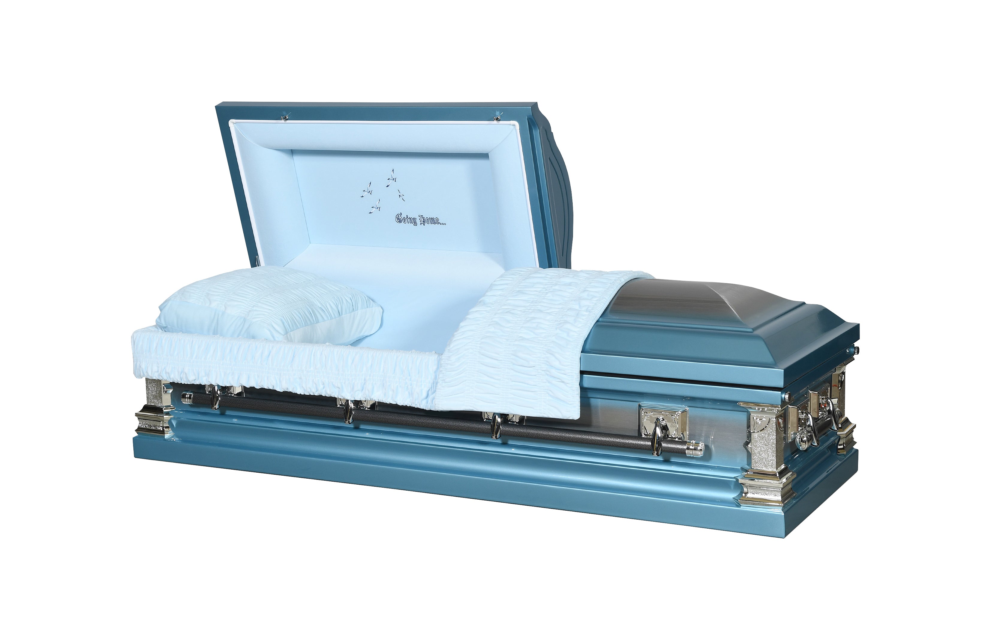 El ataúd de acero "Going Home" con forma de media cama simboliza la serenidad y la paz eterna. Fabricado con acero resistente de calibre 18 con juntas, ofrece robustez y elegancia para una despedida memorable. El acabado azul tormenta con cepillado natural crea una apariencia suave y reflectante que transmite calma y consuelo. En su interior, el ataúd cuenta con un lujoso interior de terciopelo azul con un panel bordado con la inscripción "Going Home", que simboliza un viaje apacible y el descanso eterno. La cama ajustable y la almohada de terciopelo a juego garantizan la comodidad y la postura adecuadas, mientras que las asas plateadas y los herrajes pulidos añaden una sofisticación refinada. Cada detalle del ataúd "Going Home" de calibre 18 con forma de media cama está diseñado para honrar a un ser querido con gracia, maestría y un profundo significado.