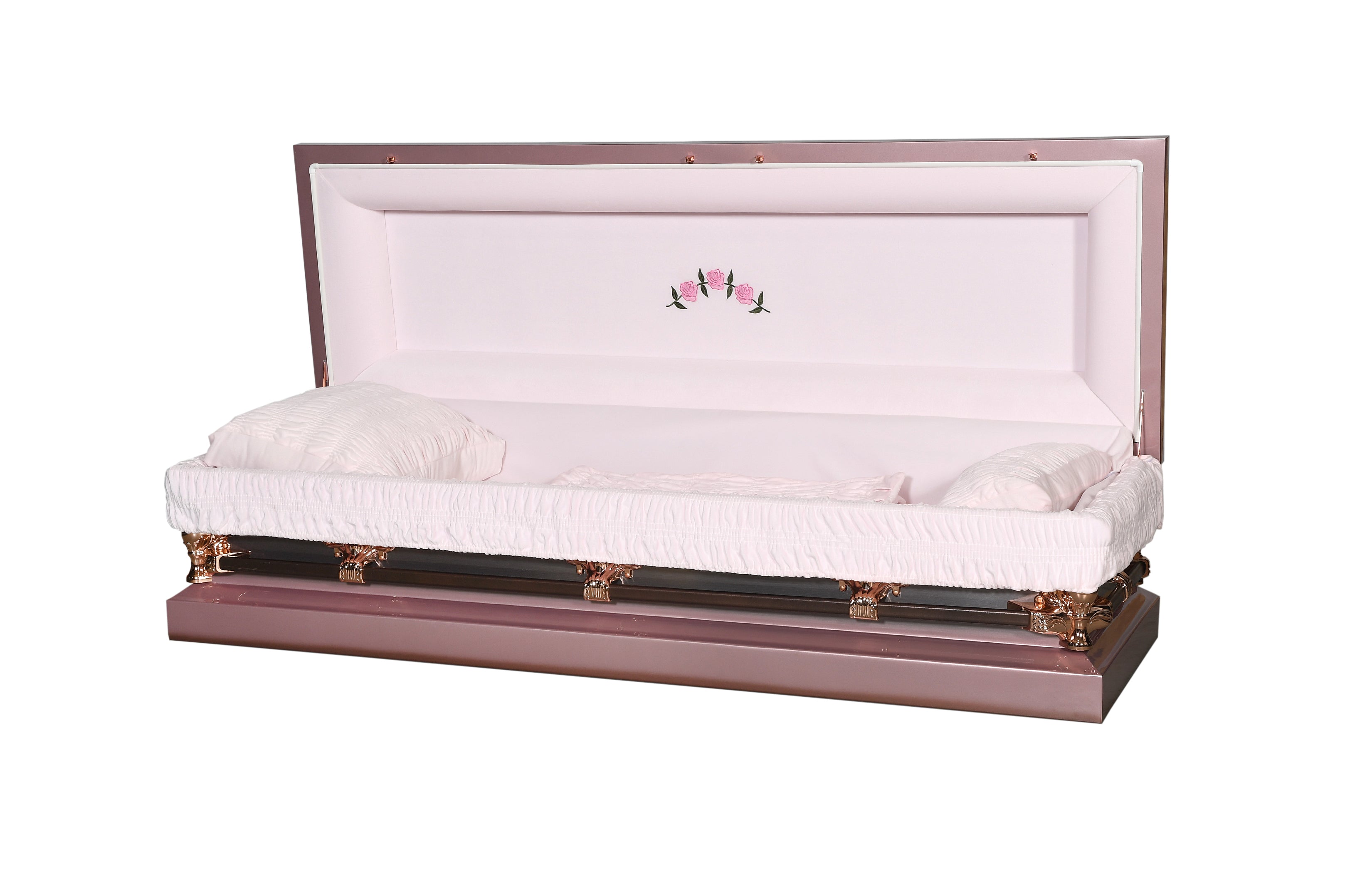 El ataúd Lilac Steel Full Couch ofrece un conmovedor equilibrio entre elegancia, durabilidad y belleza: una exquisita opción para honrar la memoria de un ser querido. Fabricado en acero de calibre 18, este ataúd con junta combina una resistencia duradera con un diseño radiante y femenino que transmite paz y serenidad. El exterior presenta un acabado bronce con un ligero tono púrpura, realzado por un cepillado natural que le confiere una apariencia suave y luminosa. El interior está completamente forrado con Confeccionado en lujoso terciopelo rosa, adornado con herrajes y barras fijas de color bronce, el ataúd Lilac Steel Full Couch refleja una sofisticación atemporal a través de una artesanía excepcional.