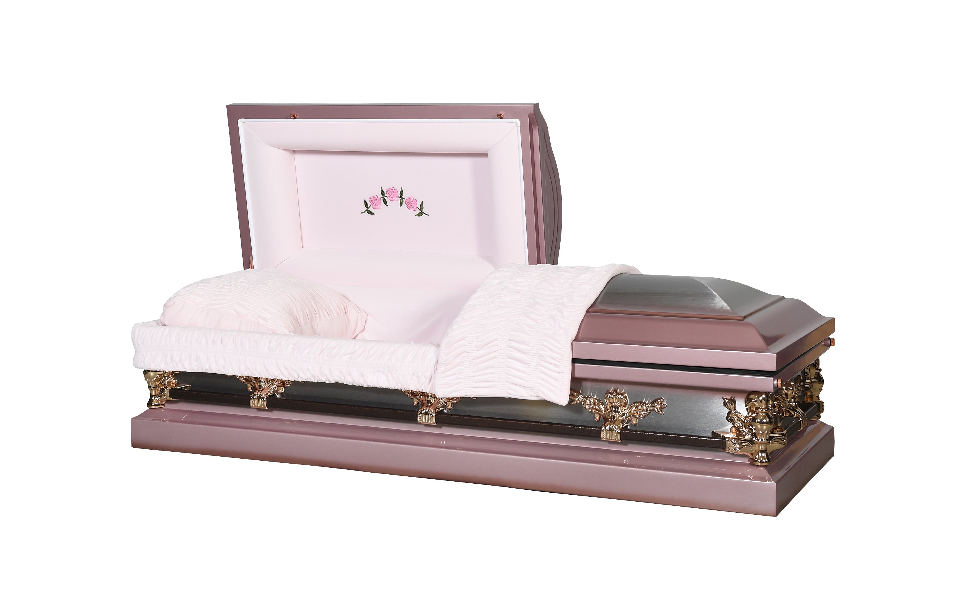 El ataúd Lilac Steel Half Couch ofrece un conmovedor equilibrio entre elegancia, durabilidad y belleza: una exquisita opción para honrar la memoria de un ser querido. Fabricado en acero de calibre 18, este ataúd con junta combina una resistencia duradera con un diseño radiante y femenino que transmite paz y serenidad. El exterior presenta un acabado bronce con un ligero tono púrpura, realzado por un cepillado natural que le confiere una apariencia suave y luminosa. El interior está completamente forrado con Confeccionado en lujoso terciopelo rosa, adornado con herrajes y barras fijas de color bronce, el ataúd Lilac Steel Full Couch refleja una sofisticación atemporal a través de una artesanía excepcional.