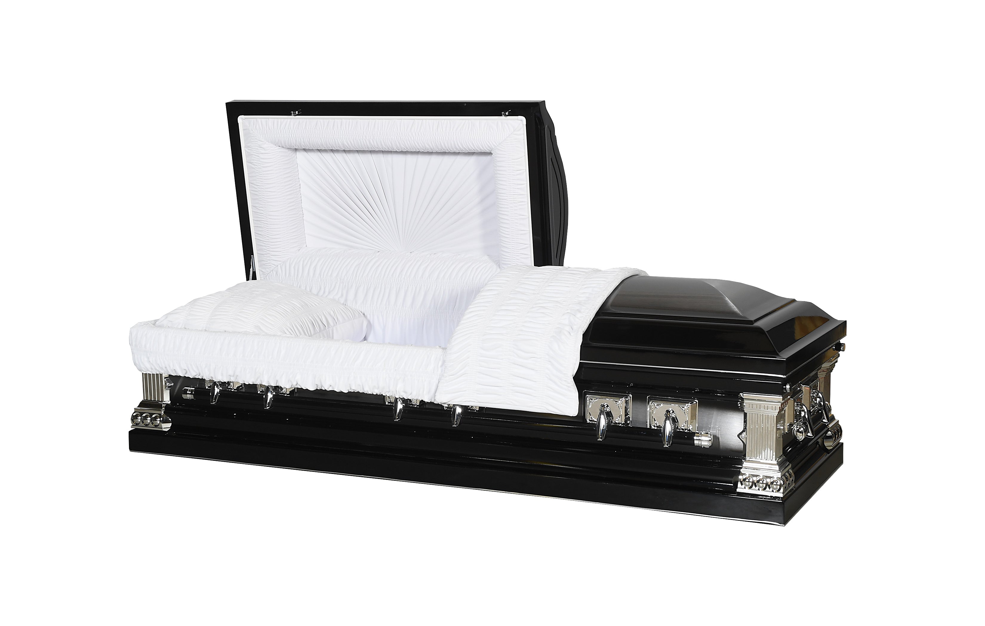 Honor your loved one with the 18-gauge Onyx Half Couch Steel Casket that features a sleek black high-gloss finish, symbolizing peace, dignity, and everlasting love. Crafted with care, it combines exceptional craftsmanship and beauty—offering families a lasting tribute at an affordable price. The interior is lined with luxurious silver velvet, featuring a stunning sunburst head panel that adds a gentle, radiant touch. Built for durability and protection, the gasketed seal ensures lasting peace of mind. The swing bar handles with polished silver hardware provide both strength and ease of handling, making this coffin as functional as it is elegant.