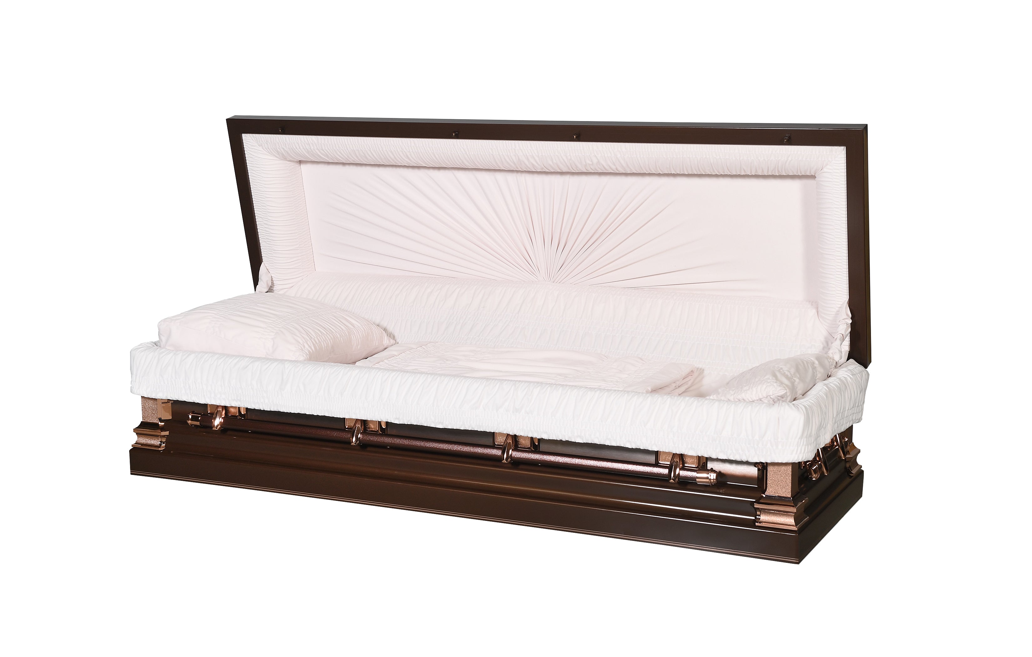 Honor your loved one with the 18-gauge Topaz Full Couch Steel Casket that features a bronze high-gloss finish, symbolizing peace, dignity, and everlasting love. Crafted with care, it combines exceptional craftsmanship and beauty—offering families a lasting tribute at an affordable price. The interior is lined with luxurious tan velvet, featuring a stunning sunburst head panel that adds a gentle, radiant touch. Built for durability and protection, the gasketed seal ensures lasting peace of mind. The swing bar handles with polished bronze hardware provide both strength and ease of handling, making this coffin as functional as it is elegant.