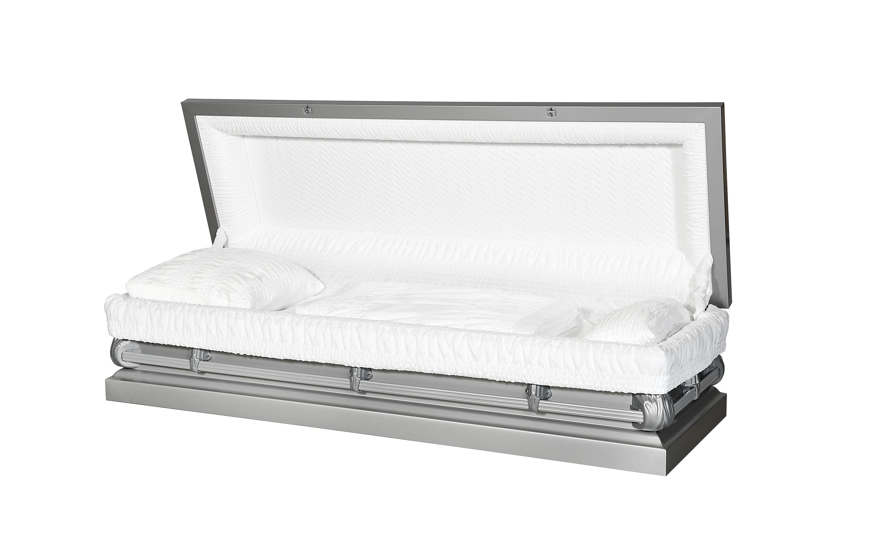Honor your loved on with our Alex Steel Silver Full Couch Casket, featuring a sleek silver finish and Ivory crepe interior. This full couch coffin combines quality craftmanship with direct-to-consumer pricing, making it an affordable casket option without compromising dignity. The Alex Steel Silver Full Couch Casket is a great option for honoring your loved one.