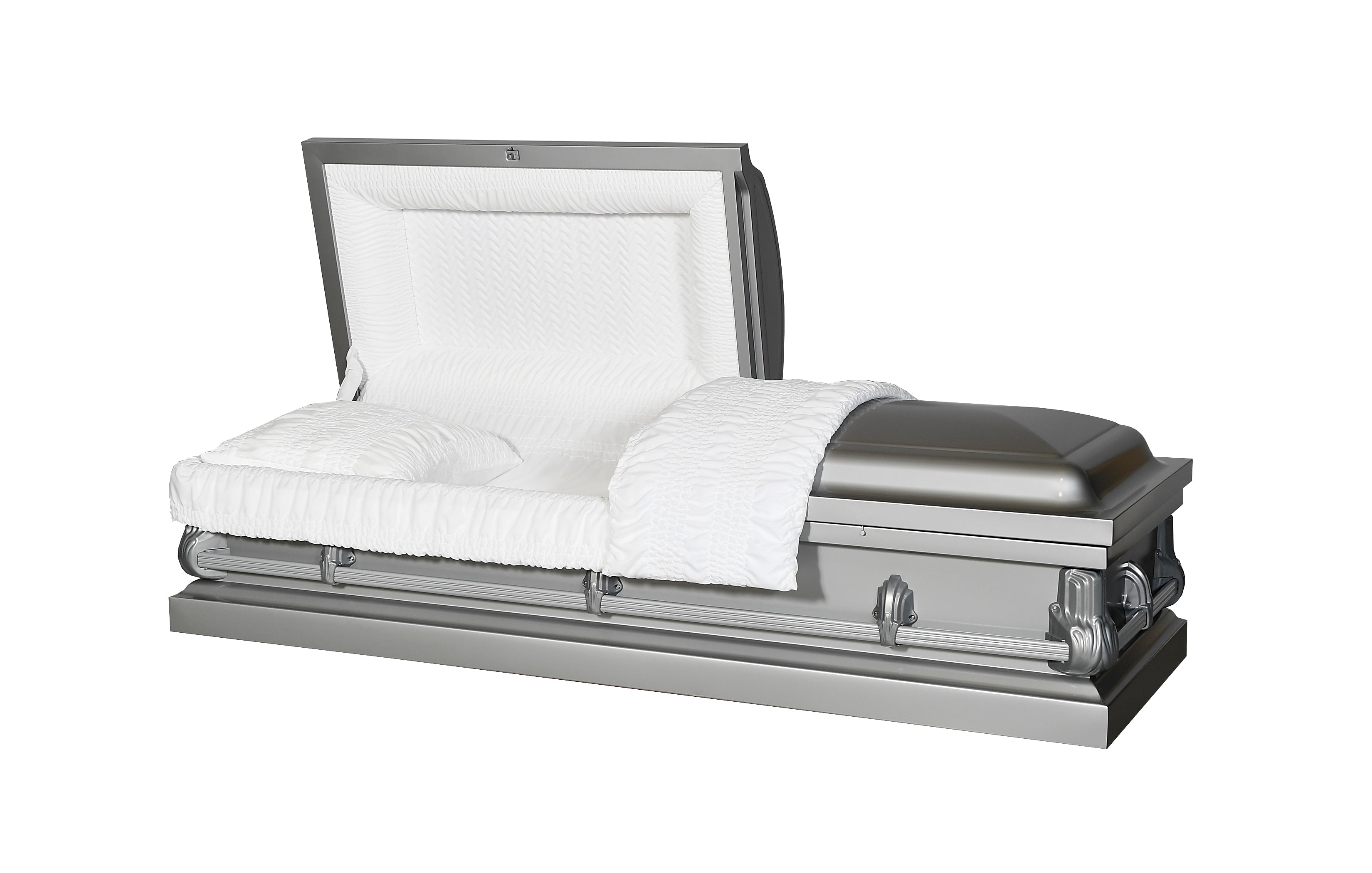 Honor your loved on with our Alex Steel Silver Half Couch Casket, featuring a sleek silver finish and Ivory crepe interior. This half couch coffin combines quality craftmanship with direct-to-consumer pricing, making it an affordable casket option without compromising dignity. The Alex Steel Silver Half Couch Casket is a great option for honoring your loved one.