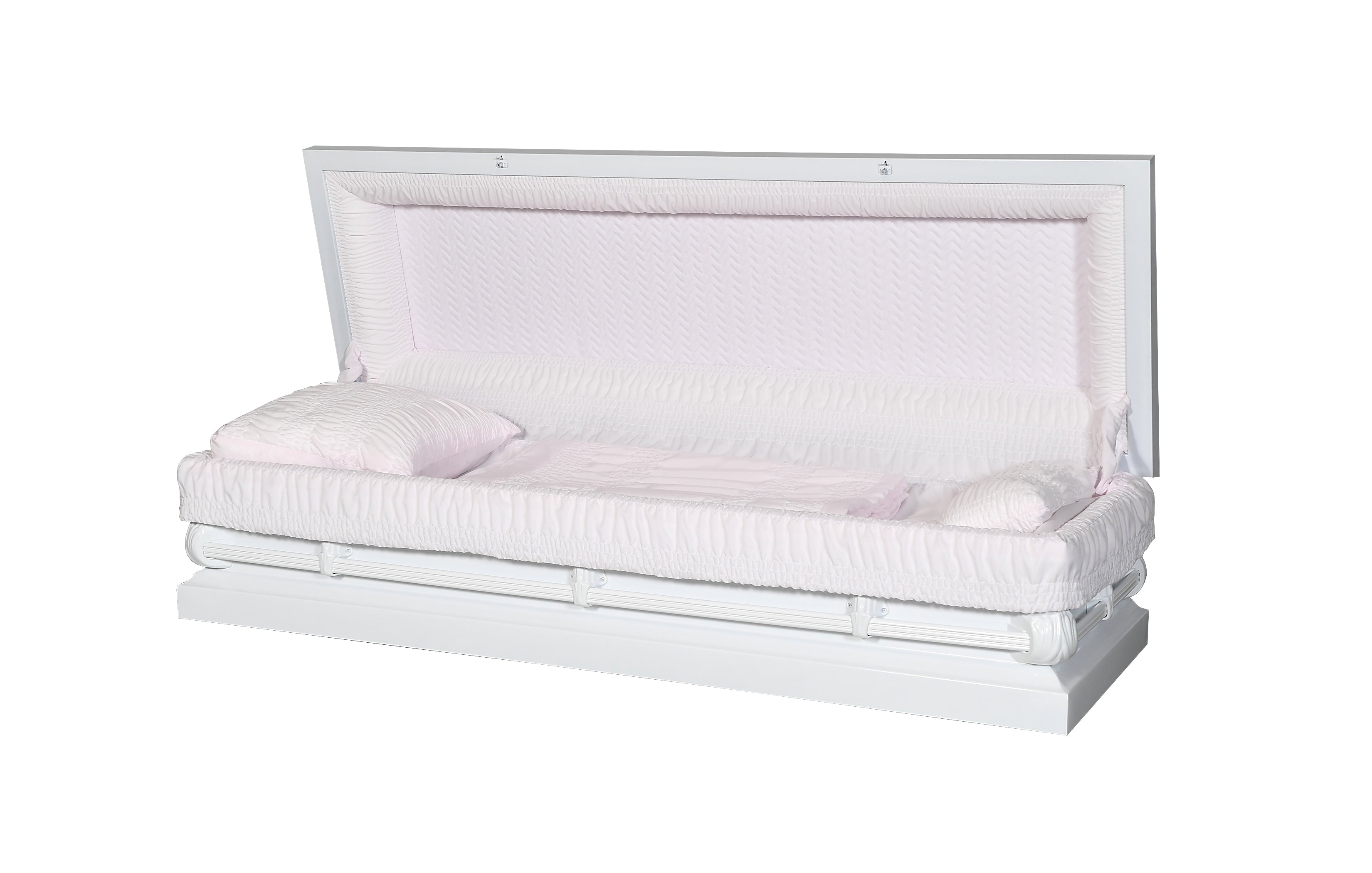 Honor your loved on with our Alex Steel White/Pink Full Couch Casket, featuring a sleek white finish and soft pink crepe interior. This full couch coffin combines quality craftmanship with direct-to-consumer pricing, making it an affordable casket option without compromising dignity. The Alex Steel White/Pink Full Couch Casket is a great option for honoring your loved one.
