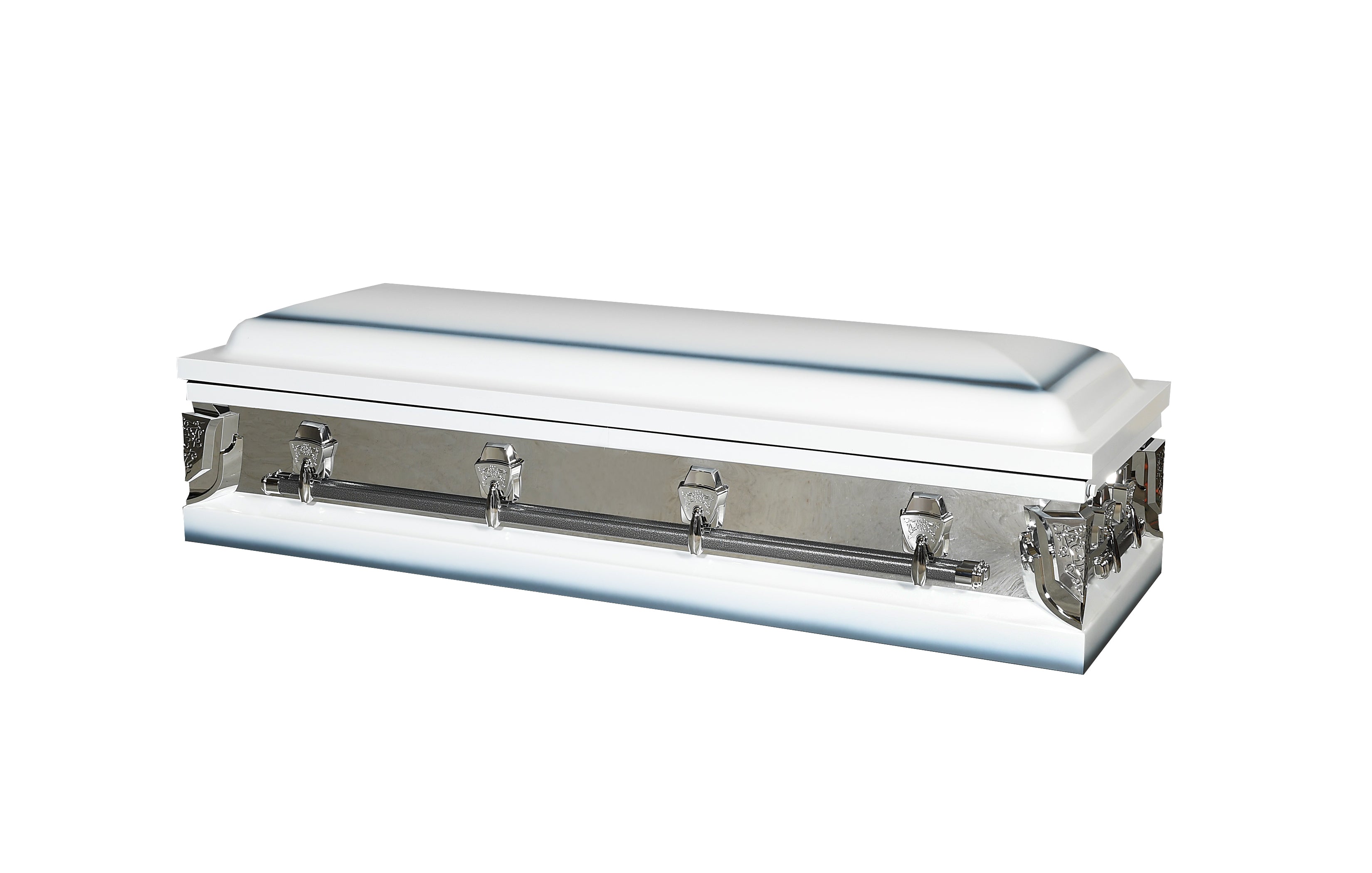 Honor your loved one with the Ivory Mist Full Couch Steel Casket that features a sleek white high-gloss finish, symbolizing peace, dignity, and everlasting love. Crafted with care, it combines exceptional craftsmanship and beauty—offering families a lasting tribute at an affordable price. The interior is lined with luxurious light blue crepe, featuring a pleated panel that allows for embroidery customization. Built for durability and protection, the gasketed seal ensures lasting peace of mind. The swing bar handles with polished silver hardware and mirrored sides that provide both strength and ease of handling, making this coffin as functional as it is elegant.